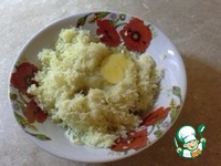 Готовим тесто. В тертый картофель добавляем 1 яйцо, соль, перец, перемешиваем. И по чуть-чуть добавляем муку. 200 грамм максимум. Можно меньше. Оно будет немного липнуть к рукам - это нормально. |