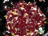 Свеклу нарезать такими же как огурец кубиками и посыпать следующим слоем. |