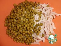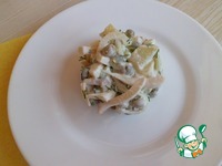 Кальмары нарезаем тонкими полосками и складываем все наши ингредиенты в емкость. Добавляем зеленый горошек, зелень. Заправляем майонезом и подаем к столу. |