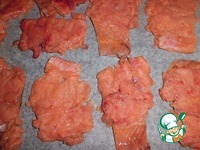 Каждый кусочек "разворачиваем", разрезаем пополам, удаляем косточки, снимаем шкуру. Значительно удобнее это делать, если рыба заморожена, нам в этот раз не повезло))) |