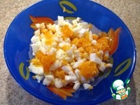 Два яйца варим в крутую, остужаем, чистим, режем мелкими кубиками. |