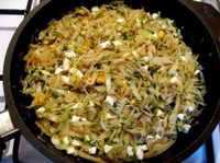 В готовую капусту кладем яйца и перемешиваем. Пока капуста жарится, готовим тесто. |