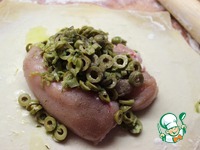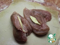 Далее на раскатанный лист теста кладу поперченную и посоленную грудку (или 2 половинки) со сделанными разрезами, куда помещены пластинки сливочного масла и... |