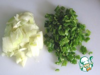 Жарим лук и перец в сковороде, добавив немного масла, в течение 5 минут. |