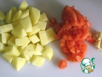 Картошку, помидор и чеснок чистим. Режем картошку крупными кубиками, чеснок и помидор измельчить. |