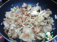 На сковороду влить растительное масло. Раскалить. Добавить мясо. Обжаривать до золотистого цвета. Добавить лук. Дожидаемся готовности лука... |