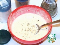 Насыпьте муку в глубокую мисочку, добавьте яйца, сметану, посолите и присыпьте специями. Хорошо смешайте, чтобы не было комков, и оставьте настаиваться в течение 15 минут. |