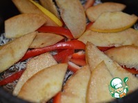 Затем сверху выложить ломтики айвы и полоски перца. плотно накрыть крышкой, уменьшить огонь до минимума и готовить 30 минут. |