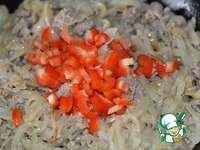 Затем добавить фарш, и готовить, разминая вилкой, пока мясо не поменяет цвет, примерно 5 минут. Перец нарезать небольшими кубиками, добавить к фаршу. |