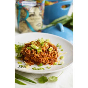 Добавить в сковородку томаты. вместе с соком и рис. Приправить солью, черным и чили перцем. Хорошо перемешать. |