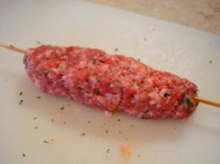 Из охлажденного фарша сформировать 4 колбаски, длиной примерно 10см, нанизав их на предварительно намоченные водой деревянные шпажки. |