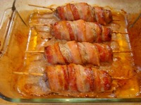 Затем каждую колбаску завернуть в полоски бекона внахлест. У меня на каждую колбаску ушло по две полоски бекона. Выложить кебабы в форму для запекания. |
