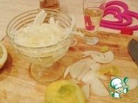 Делаем маринад для лука - смешиваем белое вино, уксус и лимонный сок, слегка солим и перчим. Лук режем полукольцами и замачиваем его в заправке минут на 10. |