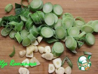 Лук-порей нарезаю колечками, чеснок - крупными кусочками. |