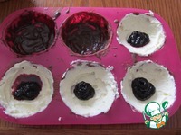 Наполняем формочки с застывшим шоколадом на половину творожной массой, середину оставляем пустой для джема. |