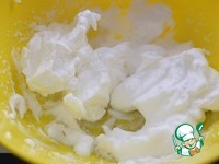 Желтки взбиваем до увеличения в объеме. К желткам добавляем 3 ложки сахара, йогурт и сливочный сыр. Взбиваем. |