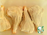 Куриные окорочка вымыть и обсушить. При помощи маленького ножа отделить кожу от мякоти и аккуратно снять ее чулком, оставив часть кожи на нижнем суставе. |