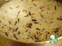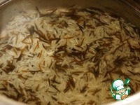 Рис промыть и замочить минут минут на 20-30. Затем воду слить, залить 200 мл. кипятка, довести до кипения и проварить пока рис не впитает всю воду. |