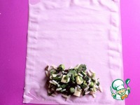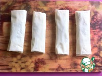 Лист фило делим на 4 части. То есть, из одного листа, получаем в итоге четыре ролла. Края смазываем водой. Выкладываем начинку с одной стороны. |