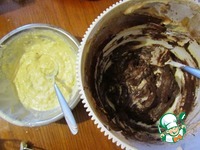 Смешать две массы в одной большой миске. Разделить тесто пополам и в половину теста добавить какао. |