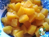 Нарезанную кубиками тыкву бланшируем в кипящей воде (отвариваем 1 минуту), выкладываем на сухую тарелку. |