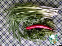 Зелёный лук и кинзу я беру по большому пучку (150-200 г). Перец тоже большой, но я люблю поострее, поэтому добавил ещё стручок сушёного. |