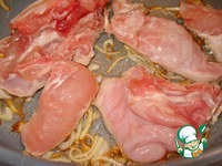 Добавила кусочки кролика и помешивая обжарила до румяной корочки. |