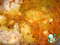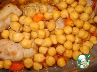 Нут я замочила в холодной воде на ночь. Кролик у меня был молоденький, я его порезала на кусочки в 3-4 см. |