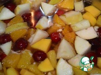 В кастрюле кипятим 1,5 стакана воды с добавлением сахара и провариваем несколько минут фрукты вместе с вишней. Затем вытаскиваем их на тарелку. |