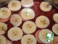 Банан режем кружочками и тоже провариваем секунд 30, а затем вытаскиваем. А сироп продолжаем варить, пока он слегка не загустеет. |