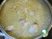 Как курится сварится, вынуть ее из бульона. Бульон остудить до температуры, чтоб не сварилось яйцо. Постепенно доливая бульон в соус, смешать соус с бульоном. |