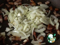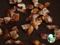 Бекон нарезать кубиками и обжарить на сковороде примерно минут 5. |