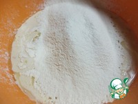 Добавляем растительное масло. По чуть-чуть всыпаем муку. |