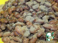 Пока тесто подходит, готовим начинку. Фасоль я замочила на ночь. Потом варила на медленном огне 2 часа. В готовую фасоль добавляем оливковое масло и специи, перемешиваем |