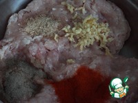 К фаршу добавить специи, берите любые на ваш вкус, у меня черный перец, паприка, соль адыгейская. Добавить чеснок, пропущенный через пресс или натертый на мелкой терке. Перемешать. |