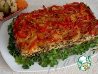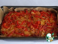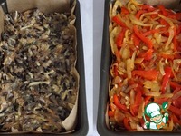 Форму смазать маслом или застелить пергаментом. Выложить фарш и сверху выложить обжаренный лук с перцем. |