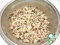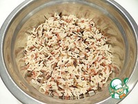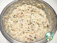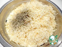 К остывшему рису добавляю натертый копченый сыр, сметану, взбитую с яйцами, прованские травы. Соль я не добавляю, так как сыр содержит достаточное её количество. |