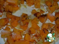Мякоть тыквы нарежьте кубиками, положите в сковороду с базиликом и дольками лука и жарьте, помешивая, 5 мин. |