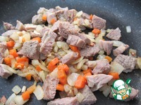 Мясо нарезать небольшими кусочками и добавить к овощам в сковородку. Обжаривать несколько минут. |