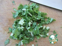 Мелко порезать свежую кинзу (или петрушку) вместе с чесноком и добавить в готовый суп. Снять с плиты, дать настояться минут 5. |