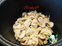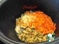 Лук, морковь измельчаем, кладем к шампиньонам, перемешиваем, крышку закрываем и готовим до окончания режима. |