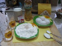 Отделяем желтки (4 яиц) от белков, в просеянную муку добавляем дрожжи, соль и сахар. |