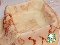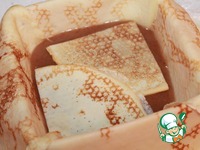 Квадратную или прямоугольную форму выстилаем пищевой пленкой, на дно кладем блинчик, по бокам также кладем блинчики. Оставляем свисающими края, чтобы потом можно было полностью закрыть форму. |