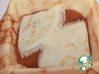 Остальные блинчики разрезаем на 4 части. Две из них укладываем по углам. Если прямоугольная форма, блин можно разрезать пополам. |