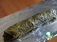На пищевую пленку раскладываем виноградные листья. Я использовала квашенные листья. Раскладываем внахлест и в несколько слоев для надежности. |