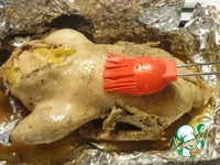 Запекаем утку еще 30-40 минут до зарумянивания. Периодически поливаем соком и смазываем маринадом с медом для того, чтобы образовалась лаковая корочка. |