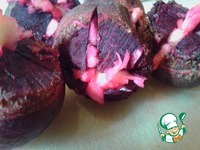 2 зубчика чеснока нарезать пластинками, сделать крестообразный надрез на основании свеклы и вставить туда кусочки чеснока. |
