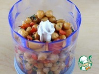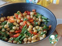 Добавить к перцу вареный нут и немного рубленной зелени, посолить, приправить черным перцем и готовить 5 мин, помешивая. |