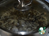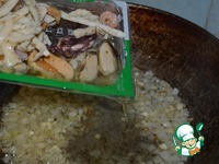 На дргой сковороде обжарить рис, долить к нему воды, посолить и варить до полуготовности, доливая воду и помешивая. |