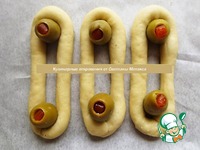 Из каждой полоски, соединяя концы, сделать петлю. По обе стороны петли положить оливки. |